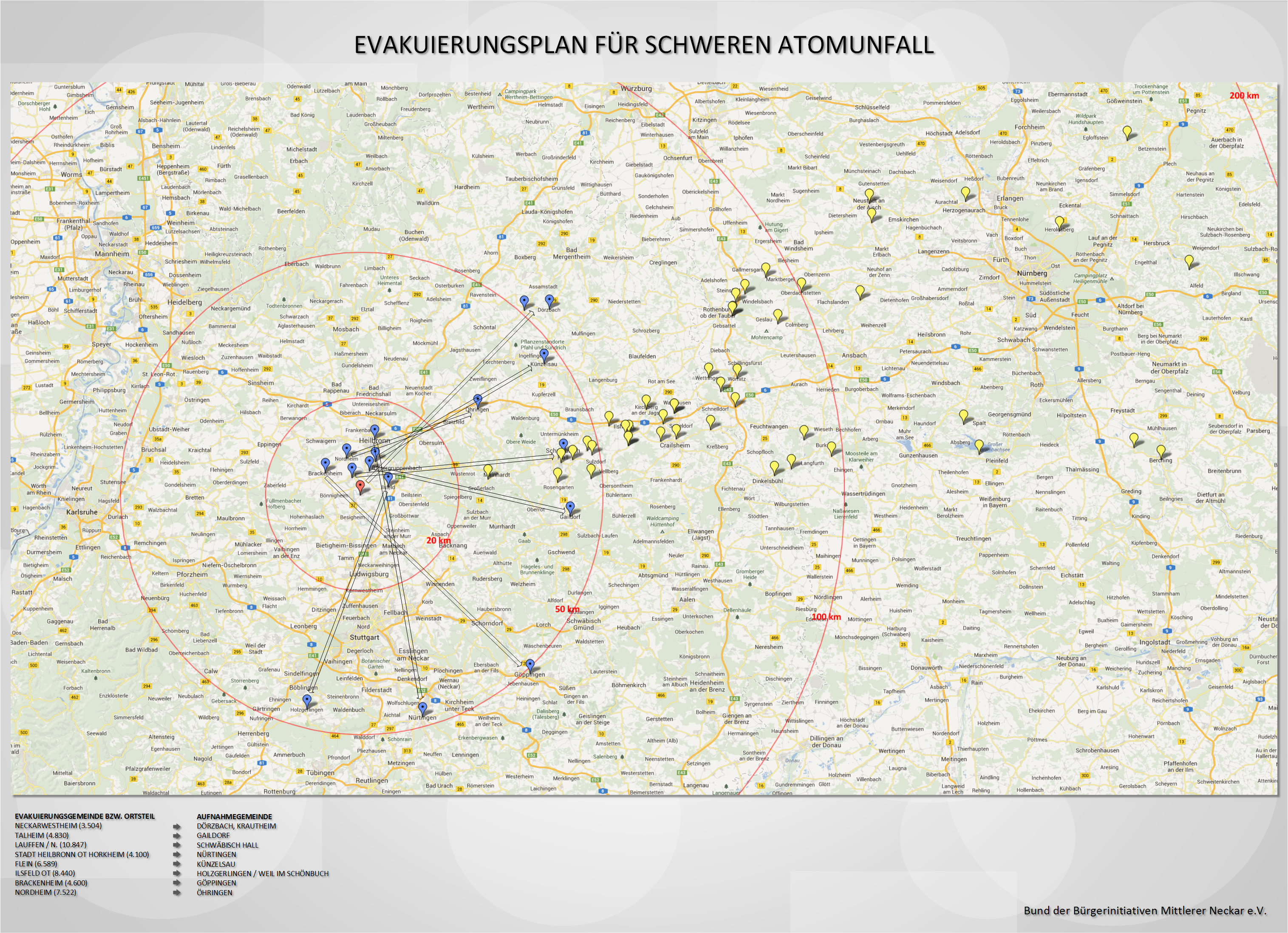 Was wäre wenn sich ein Jahr vor Abschaltung 2021 ein GAU (größtmöglich anzunehmender Unfall) ereignen würde. Die Katastrophenschutzbehörde des Innenministeriums Baden-Württemberg hat dazu Pläne für die Evakuierung der Bevölkerung bis zu einer Entfernung von 10 km um den Standort des Atomkraftwerkes vorbereitet. Demzufolge müsste Öhringen im Ernstfall alle 7.500 BürgerInnen aus Nordheim aufnehmen.